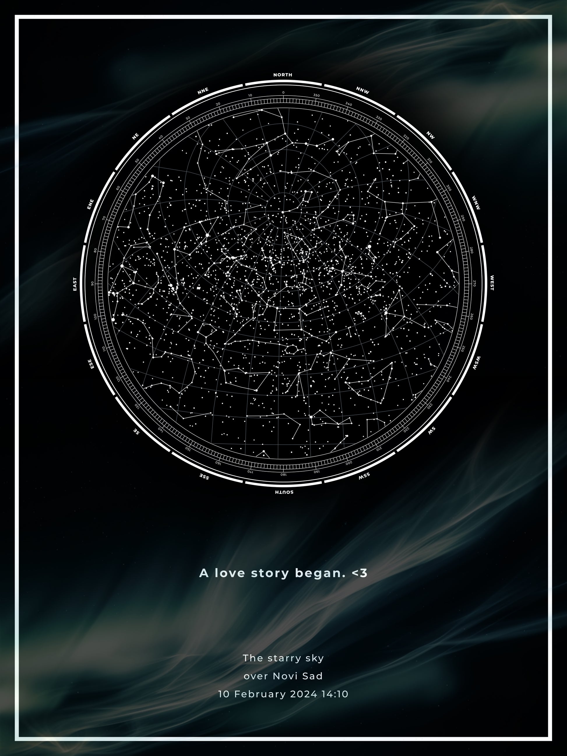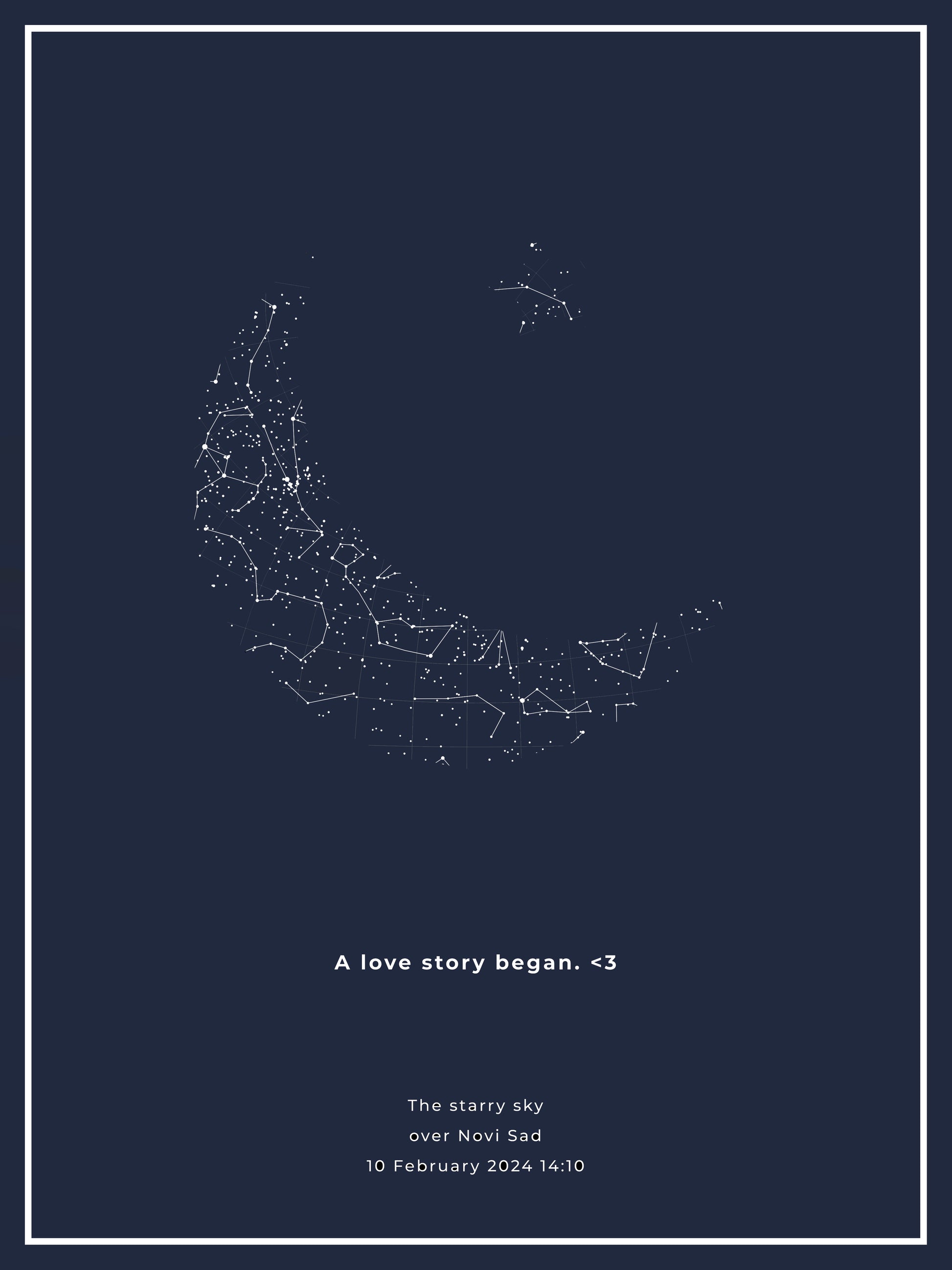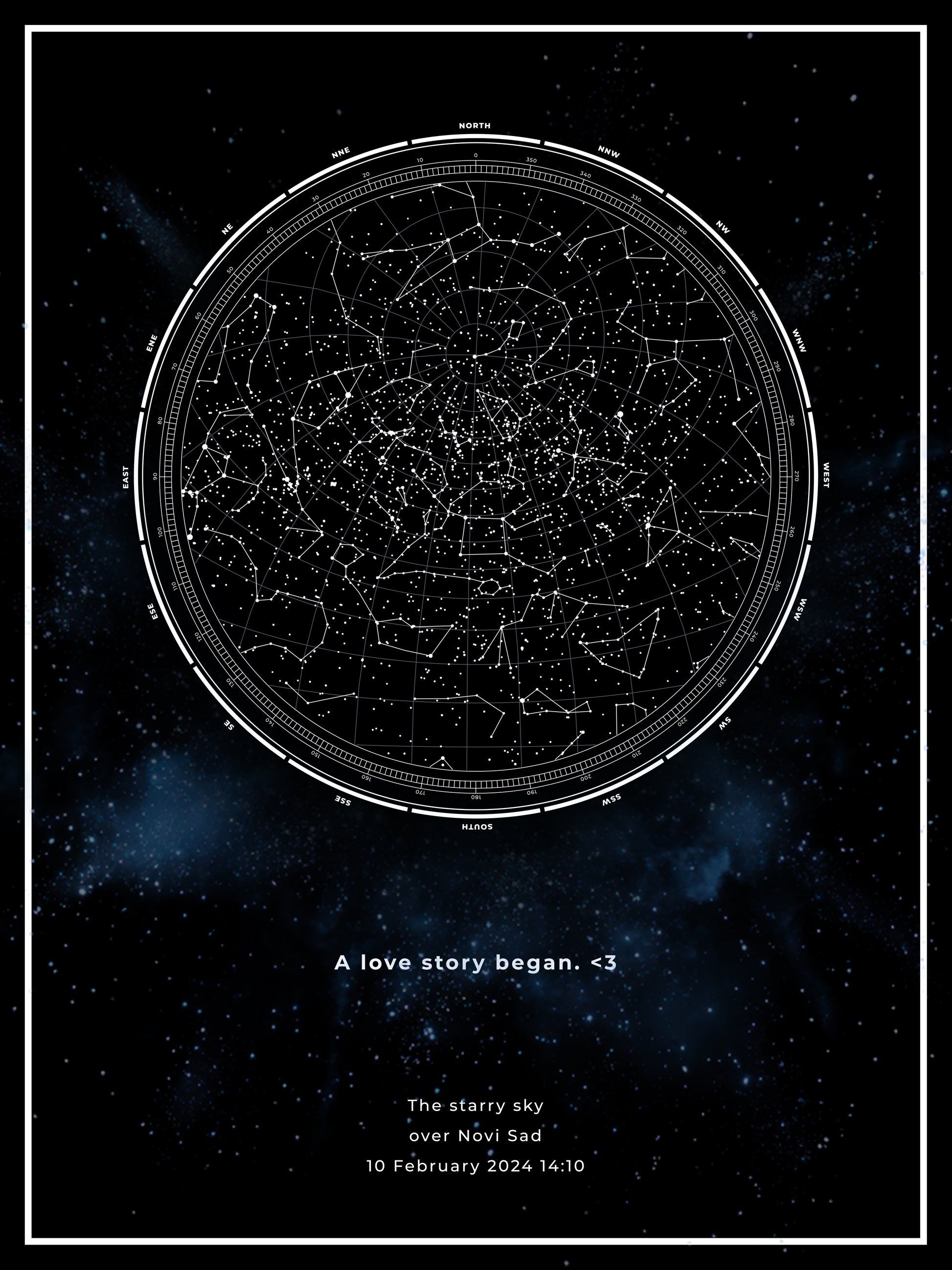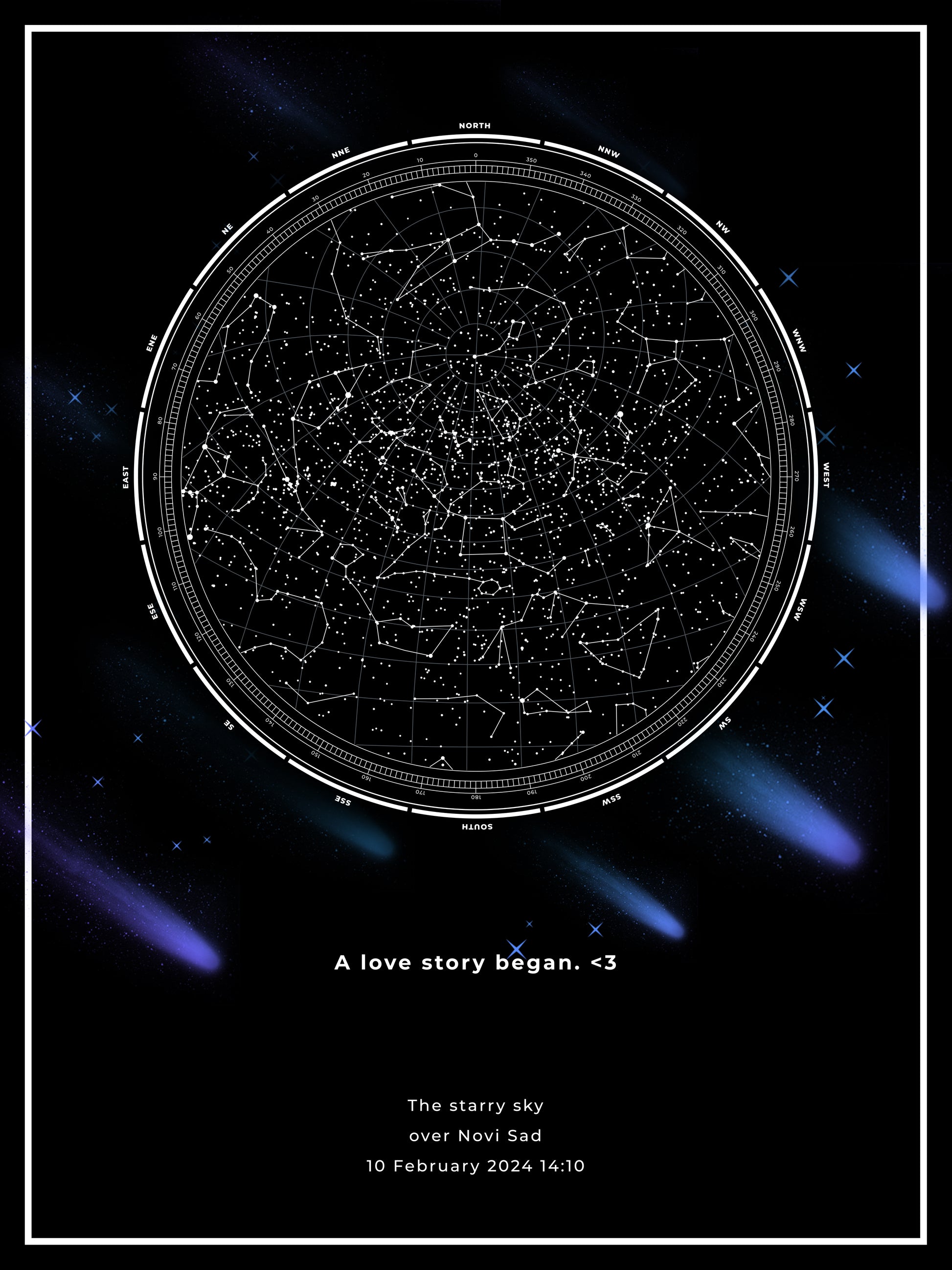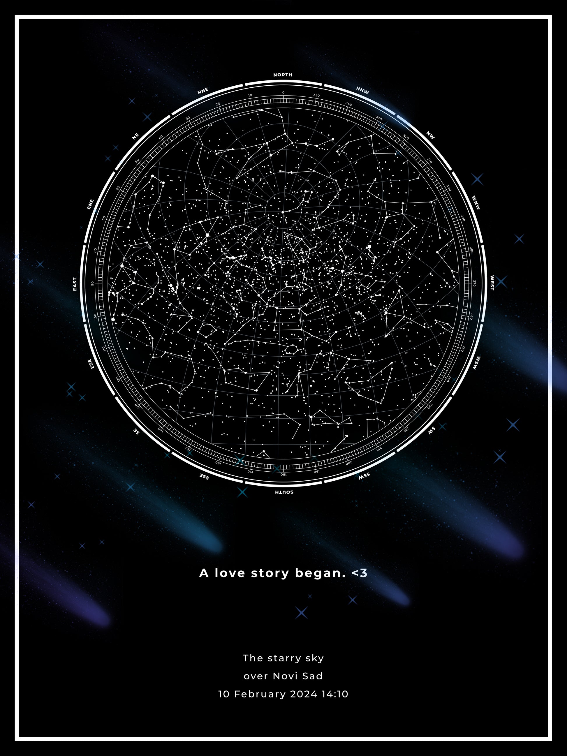 Personalizovana mapa zvezdanog neba prikazuje taฤan raspored zvezda na posebnom mestu i datumu koji vam znaฤi. Bilo da slavite godiลกnjicu, prvi poljubac ili dan kada ste se upoznali โ€” neka taj trenutak zablista zauvek. ๐Ÿ’ซ๐Ÿ’ž