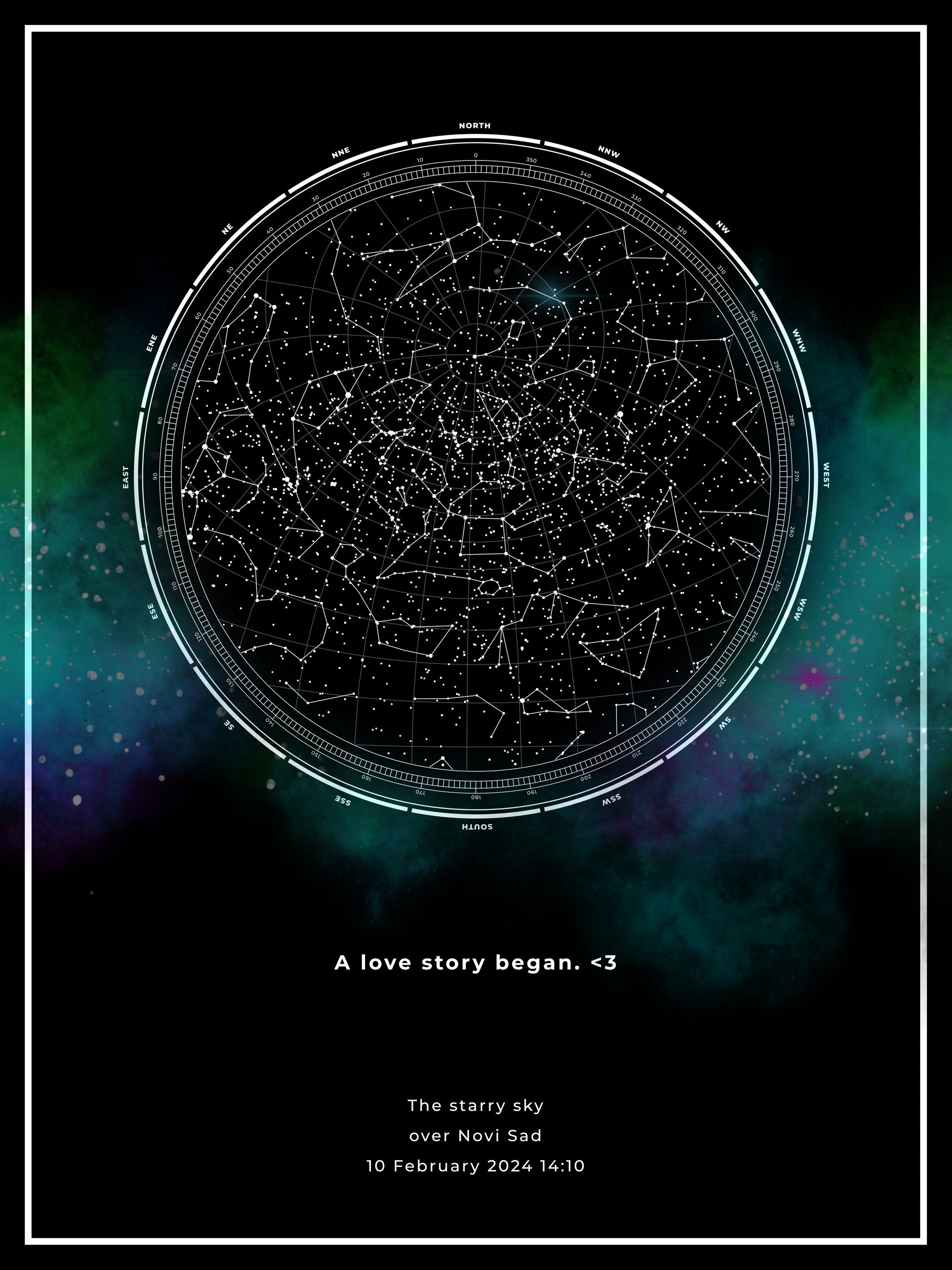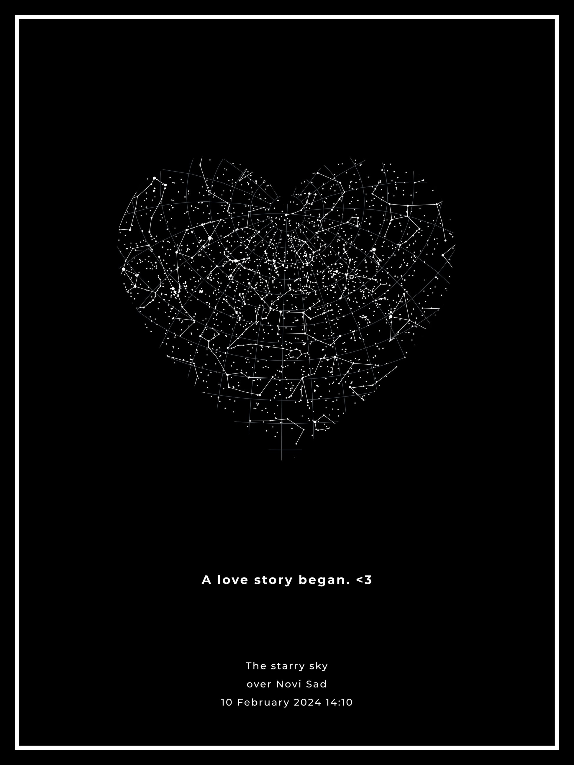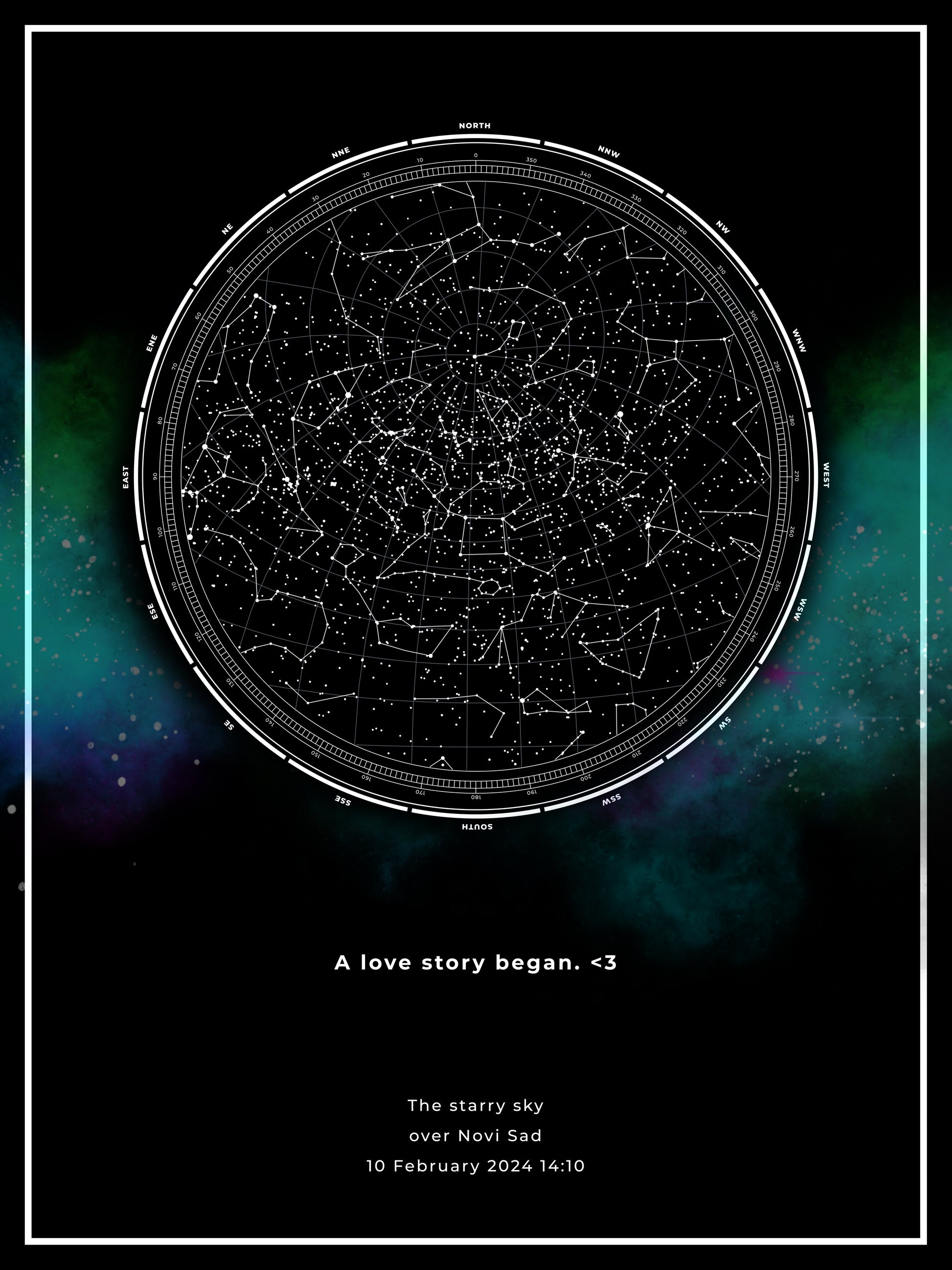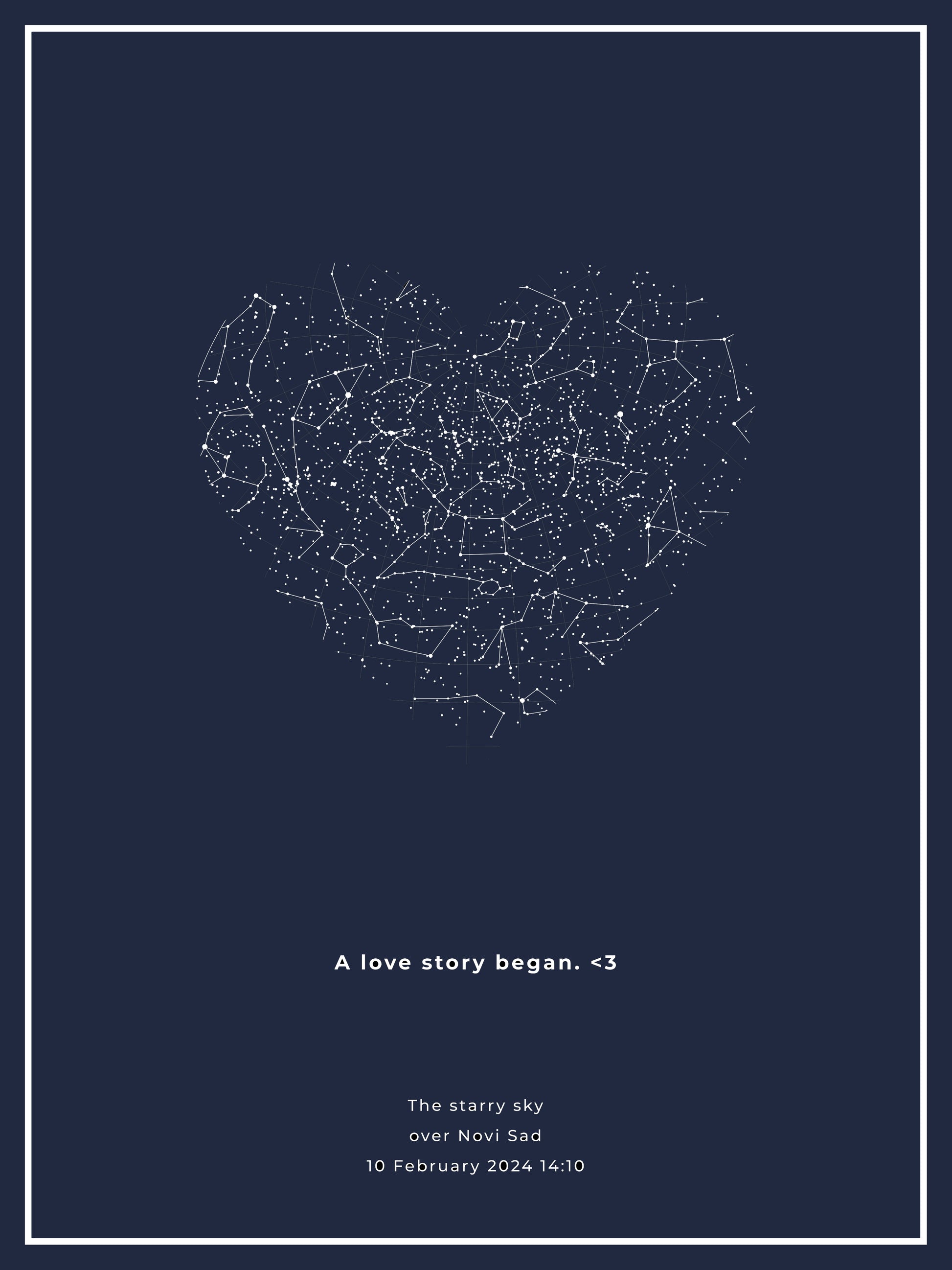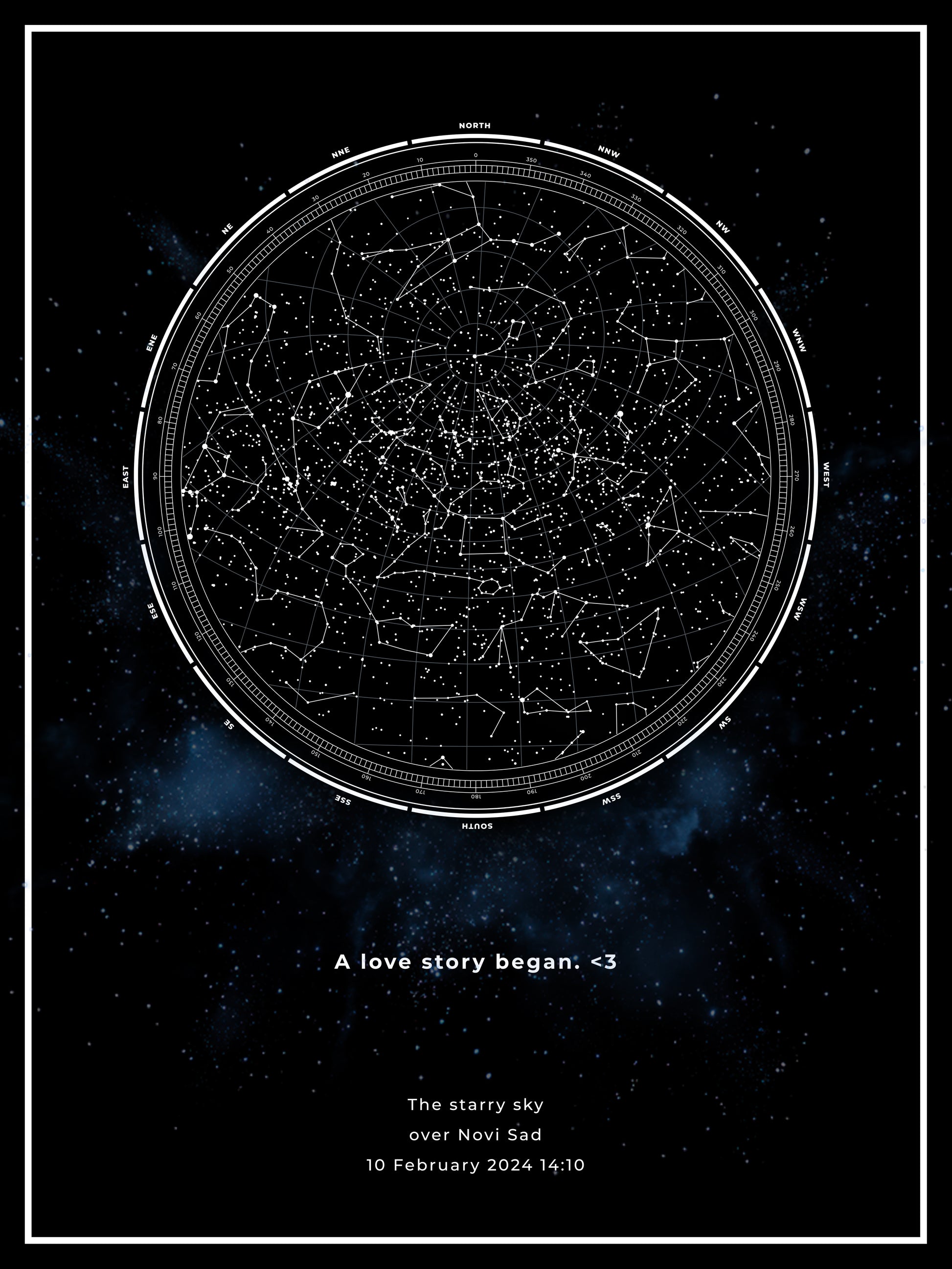 Personalizovana mapa zvezdanog neba prikazuje taฤan raspored zvezda na posebnom mestu i datumu koji vam znaฤi. Bilo da slavite godiลกnjicu, prvi poljubac ili dan kada ste se upoznali โ€” neka taj trenutak zablista zauvek. ๐Ÿ’ซ๐Ÿ’ž