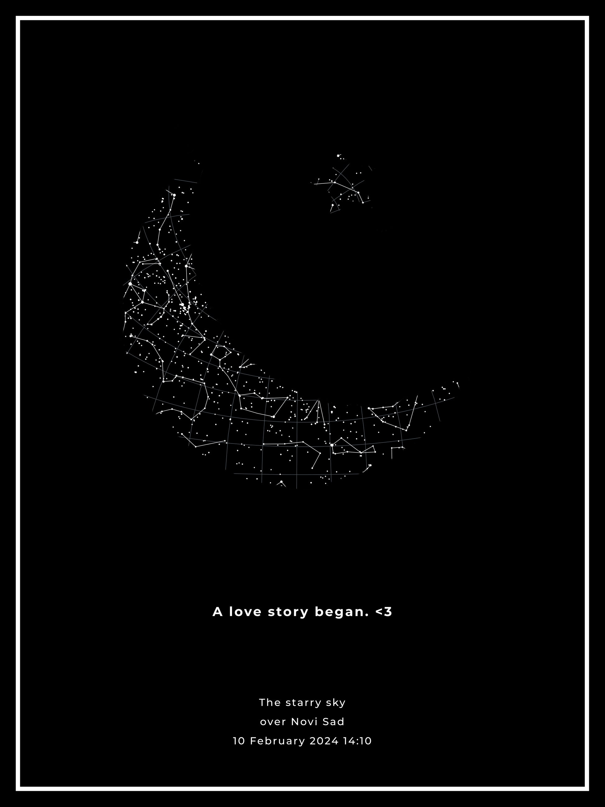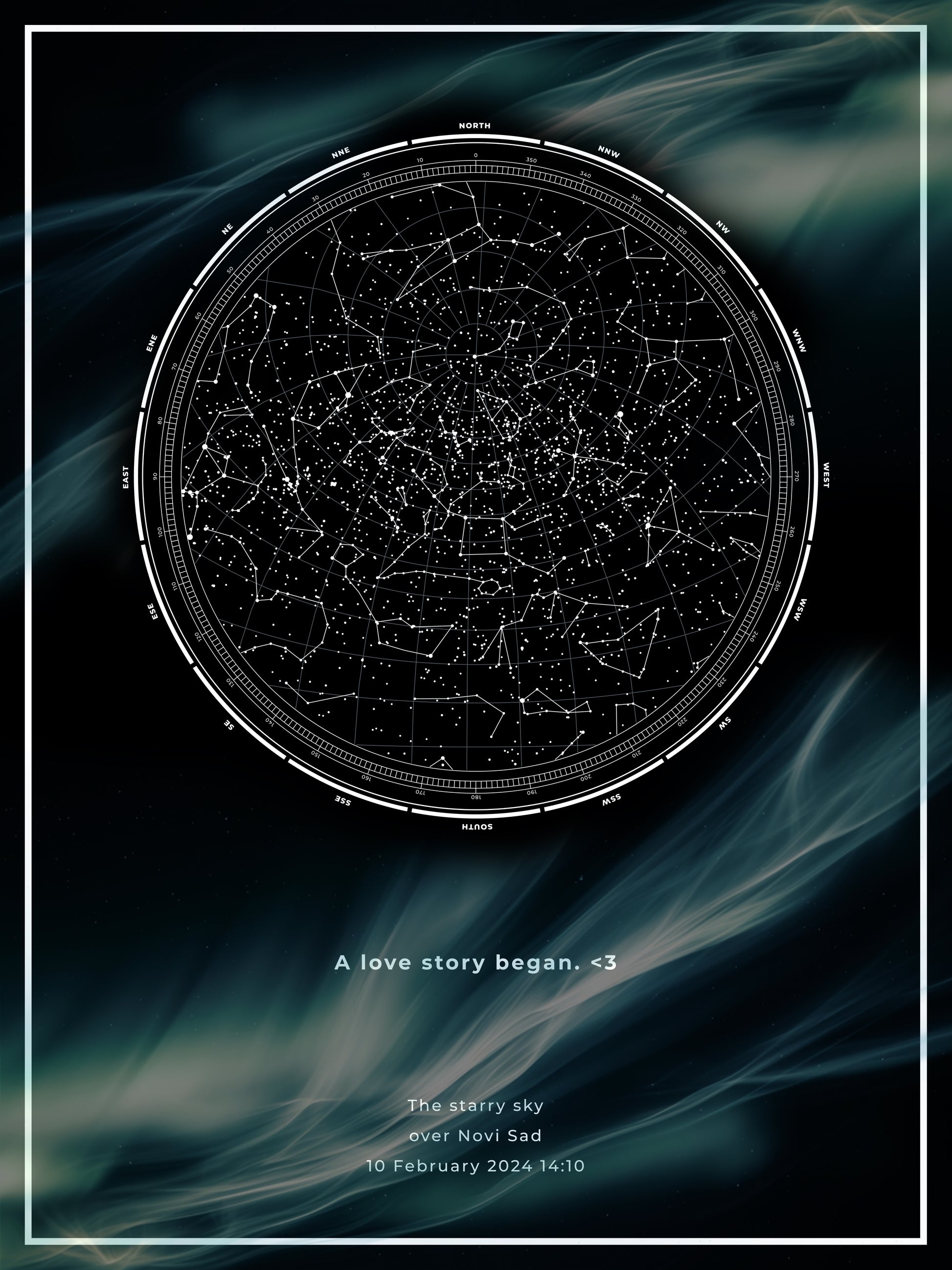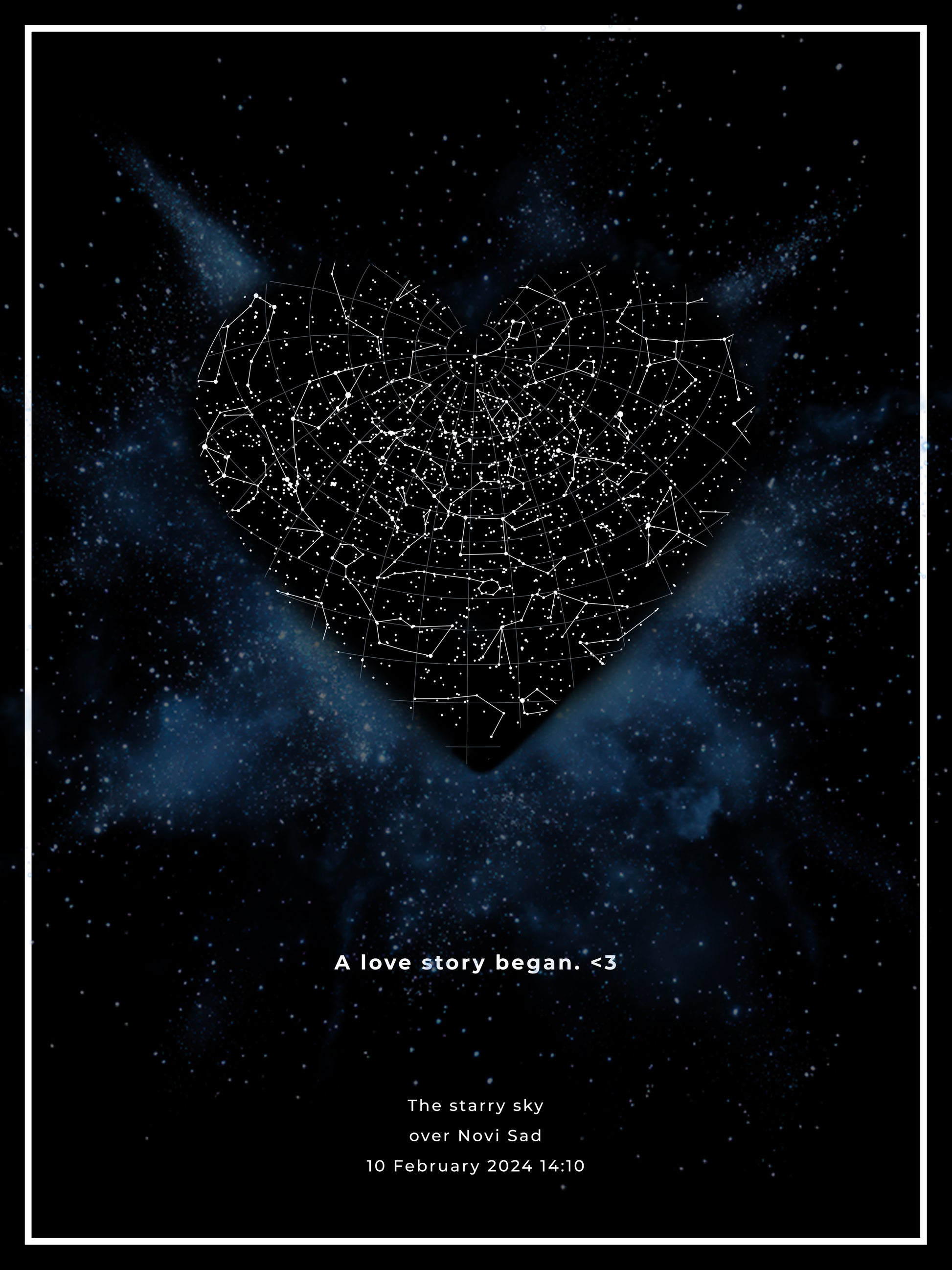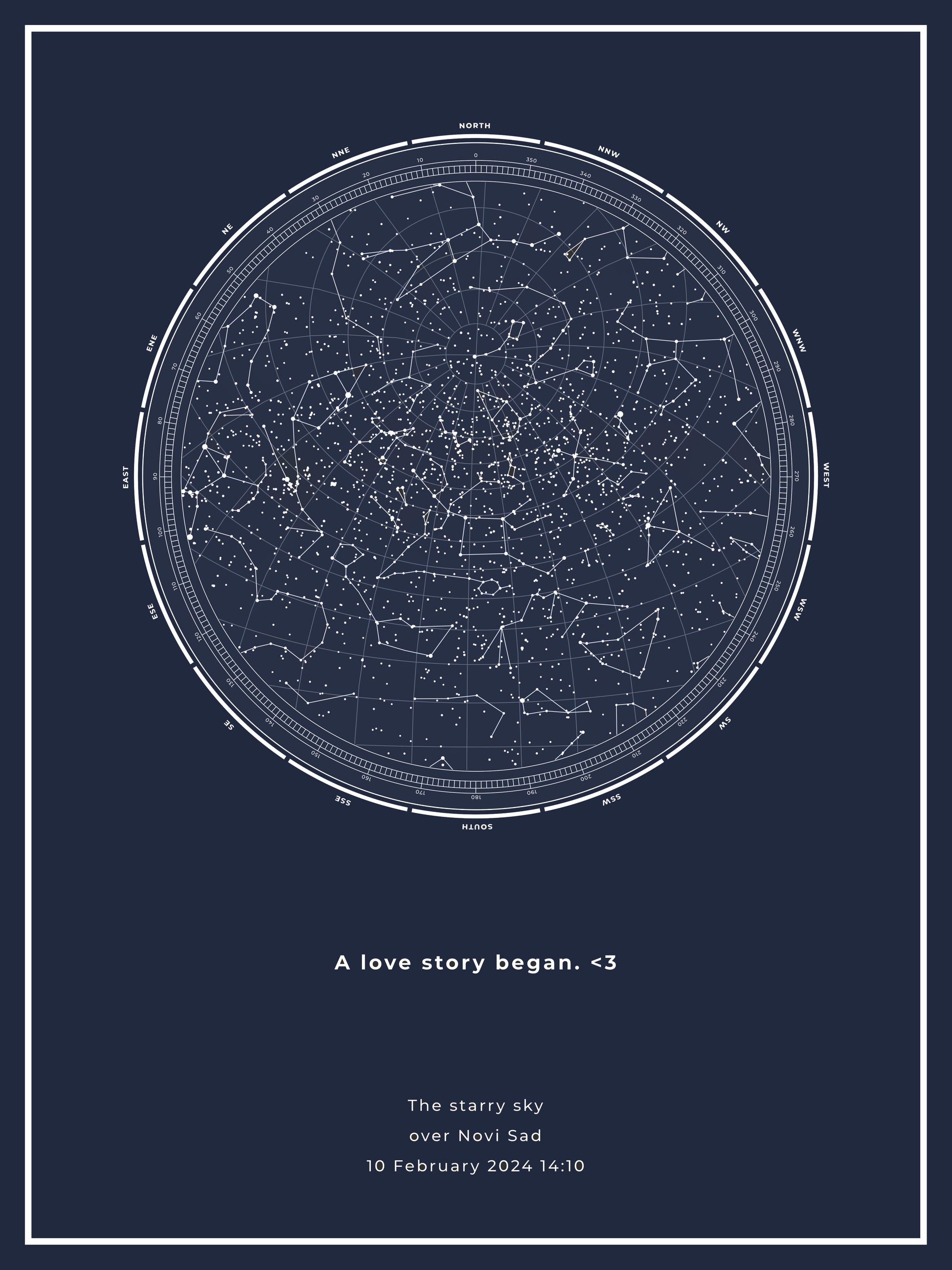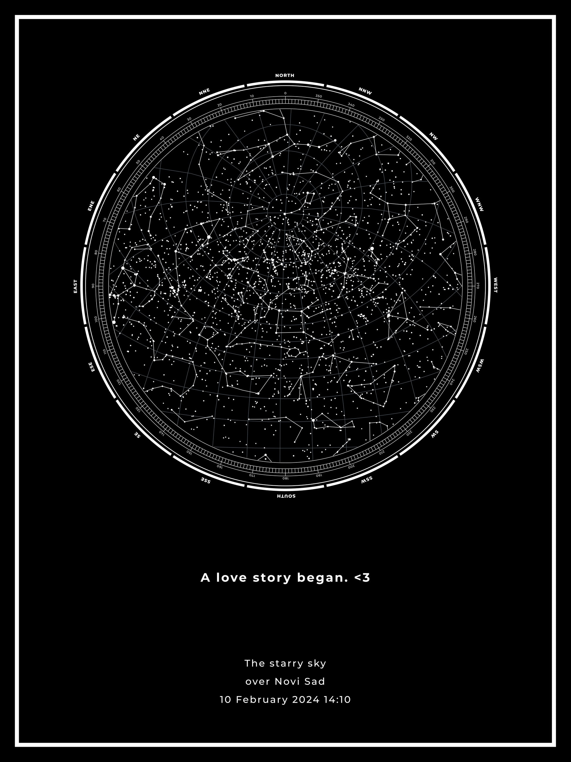 Personalizovana mapa zvezdanog neba prikazuje taฤan raspored zvezda na posebnom mestu i datumu koji vam znaฤi. Bilo da slavite godiลกnjicu, prvi poljubac ili dan kada ste se upoznali โ€” neka taj trenutak zablista zauvek. ๐Ÿ’ซ๐Ÿ’ž