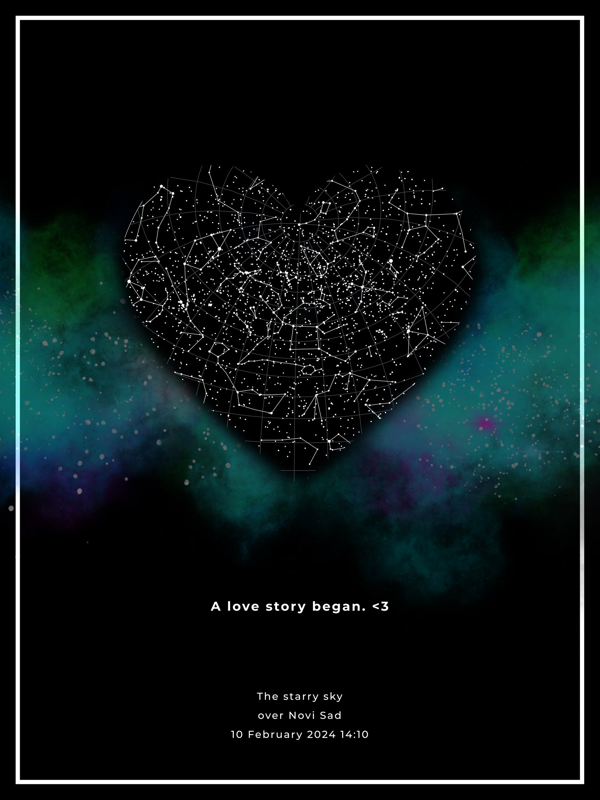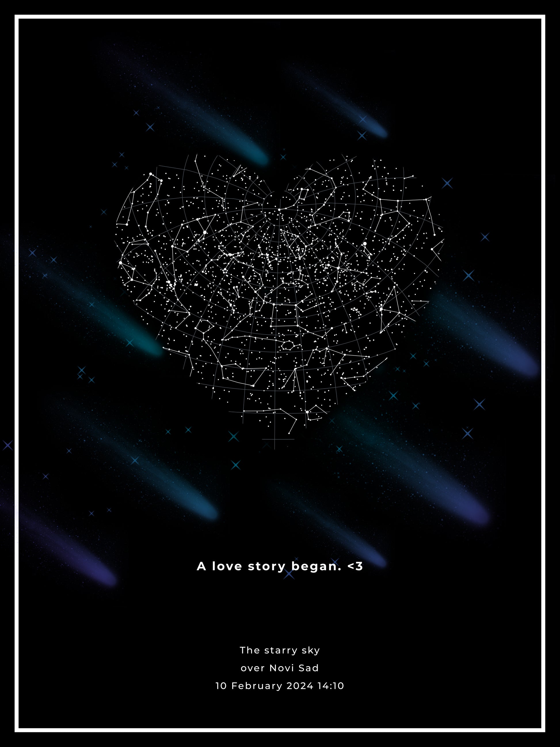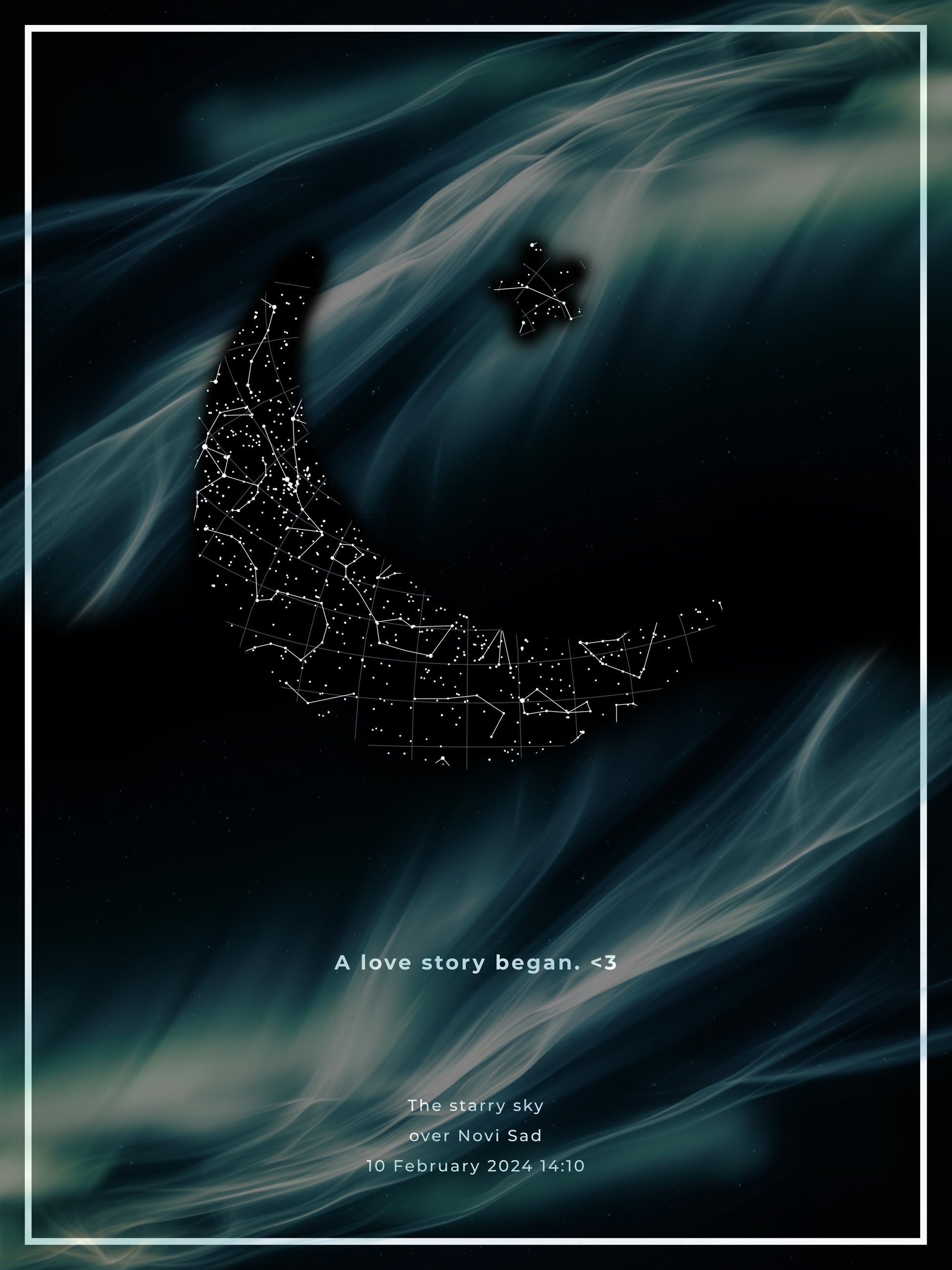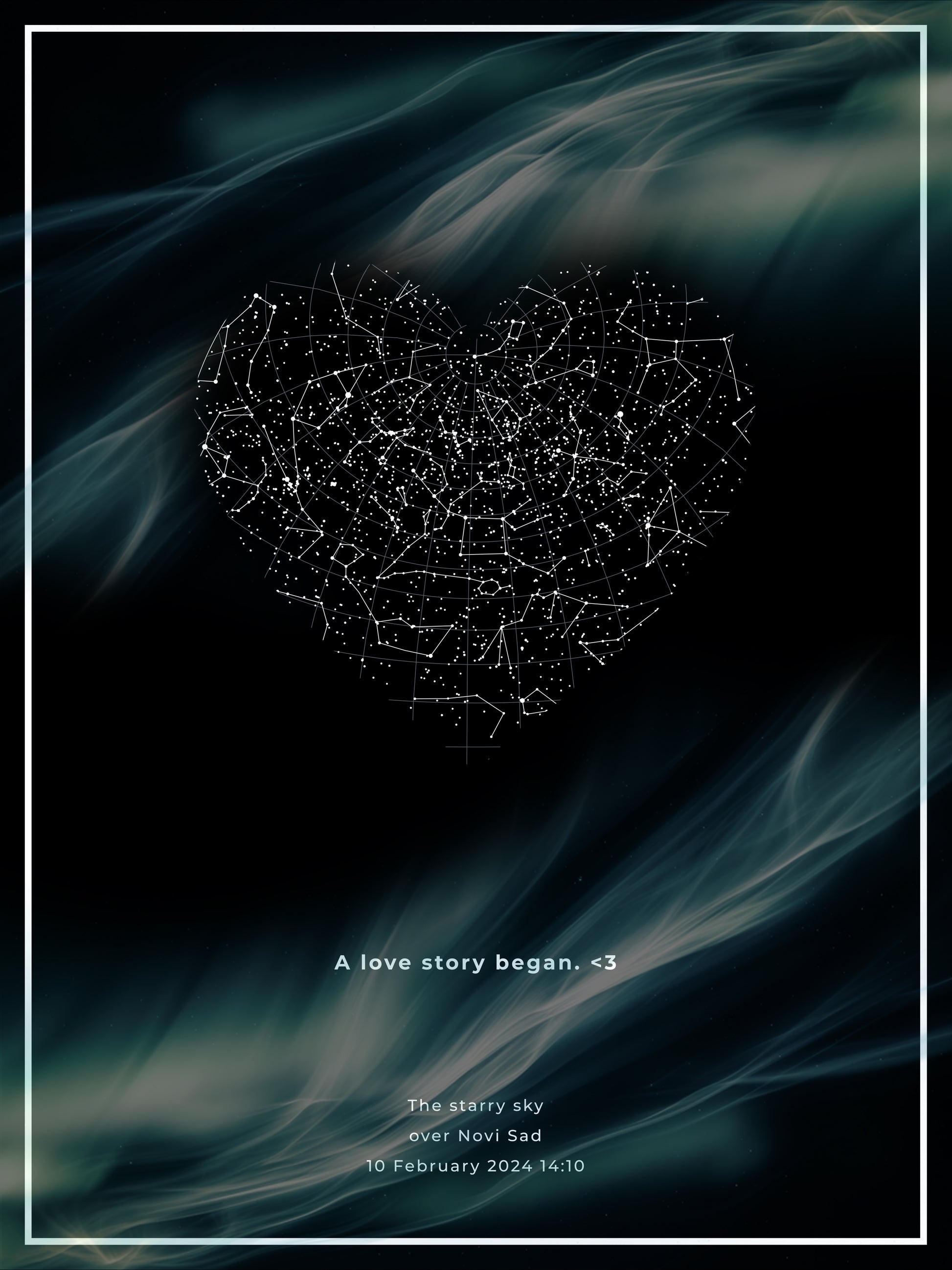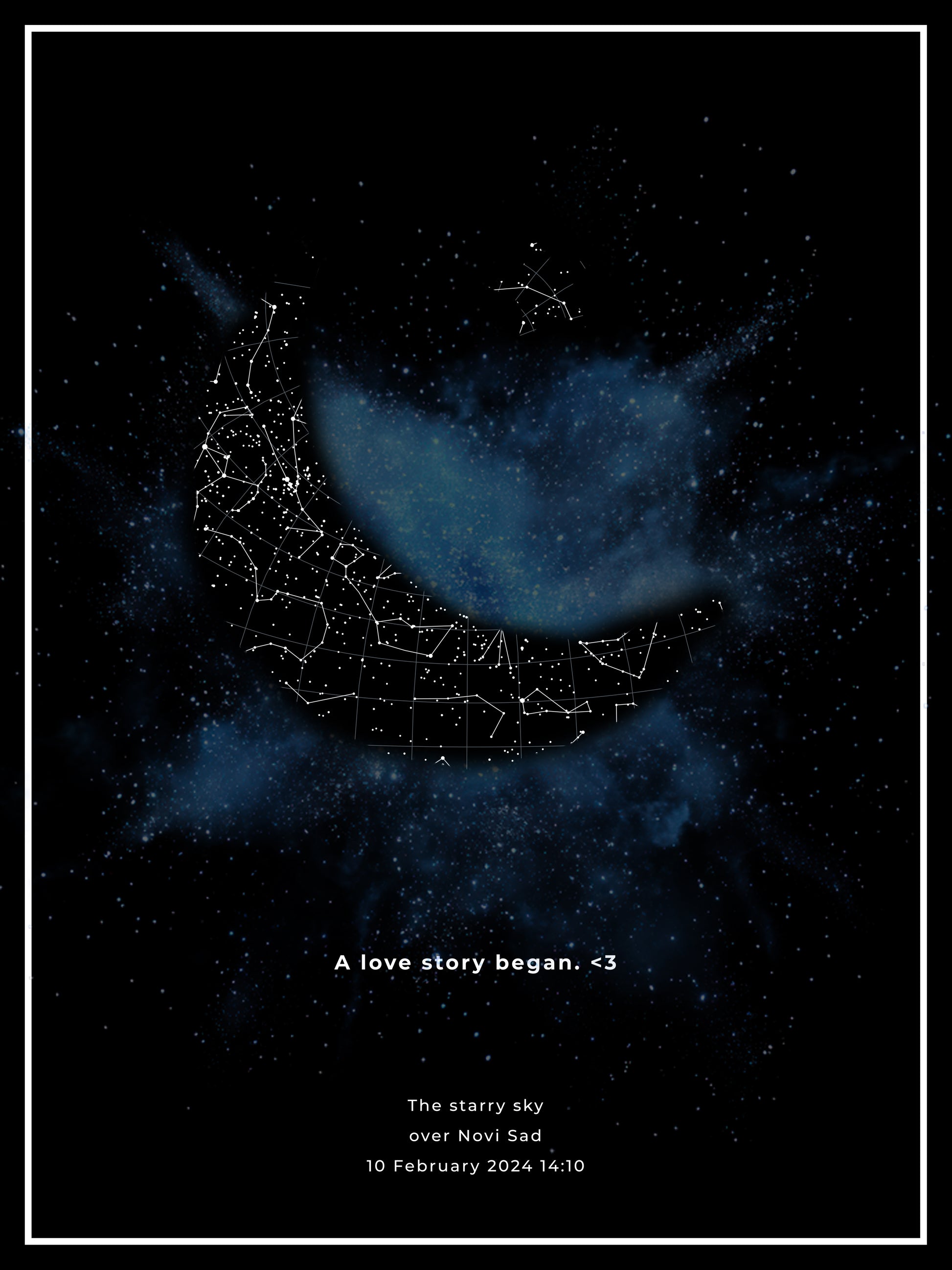 Personalizovana mapa zvezdanog neba prikazuje taฤan raspored zvezda na posebnom mestu i datumu koji vam znaฤi. Bilo da slavite godiลกnjicu, prvi poljubac ili dan kada ste se upoznali โ€” neka taj trenutak zablista zauvek. ๐Ÿ’ซ๐Ÿ’ž